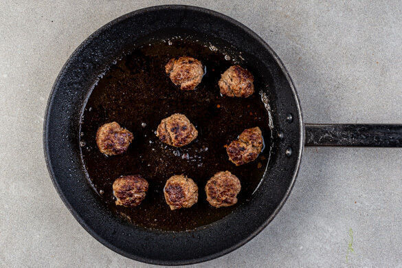 Das Hackfleisch gründlich mit 2EL Senf sowie je 1/2TL Salz und Pfeffer verkneten und zu 16 walnussgroßen Hackbällchen formen. Die Hackbällchen in einer großen Pfanne mit 1EL Olivenöl bei mittlerer bis starker Hitze in 8–10Min. rundum goldbraun und gar braten.