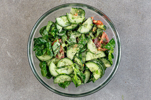 Die Gurken, die Tomaten, den Dill und den Feldsalat mit der 1/2 des Dressings vermengen. Die Beten in ein Sieb abgießen und abtropfen lassen. Den Bulgur auf Teller verteilen, dann den Salat, die Hackbällchen und die Beten darauf anrichten. Mit dem restlichen Dressing beträufeln und servieren.