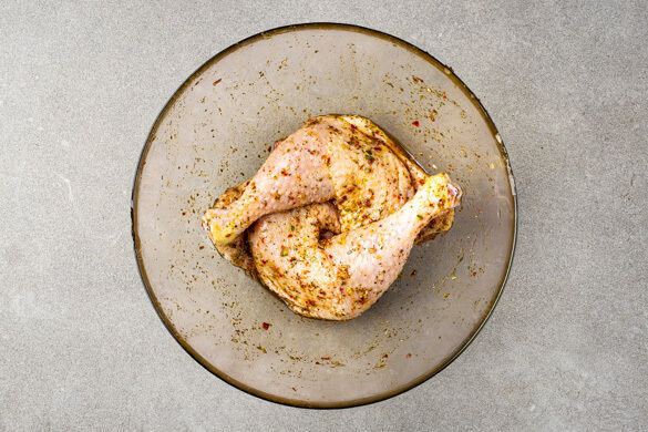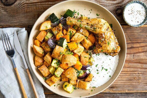 Außen knusprig, innen saftig – das sind unsere köstlichen Hähnchenschenkel, die vor ihrer Wärmebehandlung im Ofen in einer aromatischen Gewürzmischung aus Oregano, Thymian und Rosmarin entspannen. Ein raffinierter Salat aus Karotten, Zucchini und geröstetem Brot mit Knoblauch bringt willkommene Abwechslung auf den Tisch. Dazu gibt es einen erfrischenden Joghurtdip mit Petersilie. Mmmh!