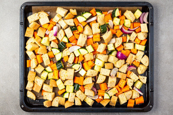 Das Gemüse und die Brötchenwürfel mit 1EL Olivenöl und je 1 kräftigen Prise Salz und Pfeffer auf einem mit Backpapier ausgelegten Backblech vermengen und im unteren Teil des Ofens platzieren. Das Fleisch auf ein Backrost legen und in den oberen Teil des Ofens schieben, damit der austretende Bratensaft auf das Gemüse tropfen kann.