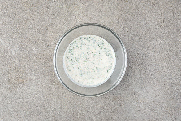 Die Petersilie samt Stängeln fein schneiden und ein wenig für die Garnitur beiseitelegen. Die restliche Petersilie mit dem Joghurt und 2EL Mayonnaise verrühren. Den Dip mit Salz und Pfeffer abschmecken.