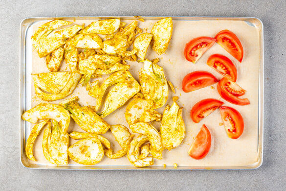 Den Fenchel und den Knoblauch auf einem mit Backpapier ausgelegten Backblech mit der 1/2 des Currypulvers, 1EL Olivenöl und 1 kräftigen Prise Salz vermengen. Die Tomaten ebenfalls auf das Blech legen und das Gemüse im Ofen 15–18Min. goldbraun rösten. Den Fenchel nach der Hälfte der Zeit wenden.