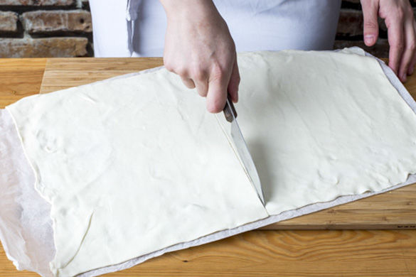 Inzwischen den Blätterteig mit den Händen vorsichtig etwas auseinander ziehen, so dass er etwas größer und dünner wird. Dann einmal quer in der Mitte teilen, dass zwei Stücke entstehen. Den Lachs grob in kleine Stücke teilen.
