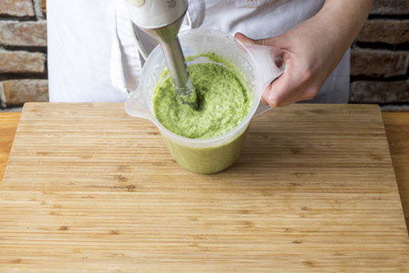 Nun den Brokkoli mit den Zwiebeln und der Sahne zu einer geschmeidigen Masse pürieren und mit Salz und Pfeffer abschmecken.