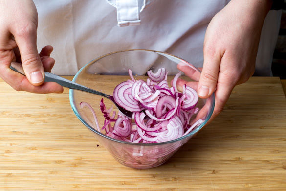 Den Backofen auf 180°C Umluft oder 200°C Ober-/Unterhitze vorheizen. Die Zwiebel schälen, halbieren und in feine Streifen schneiden. In einer kleinen Schüssel mit 1/2TL Salz, 1TL Zucker und 1EL Essig mischen und ziehen lassen.
