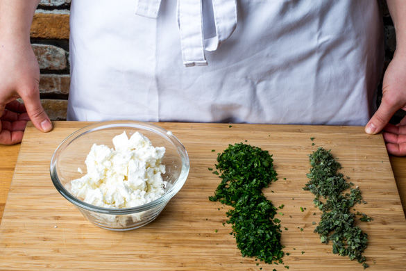 Die Blätter der Petersilie und des Oreganos von den Stängeln streifen und separat fein hacken. Den Käse mit den Händen grob zerkrümeln.