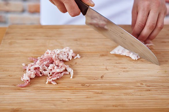 Den Speck übereinanderlegen und in sehr feine Streifen schneiden.