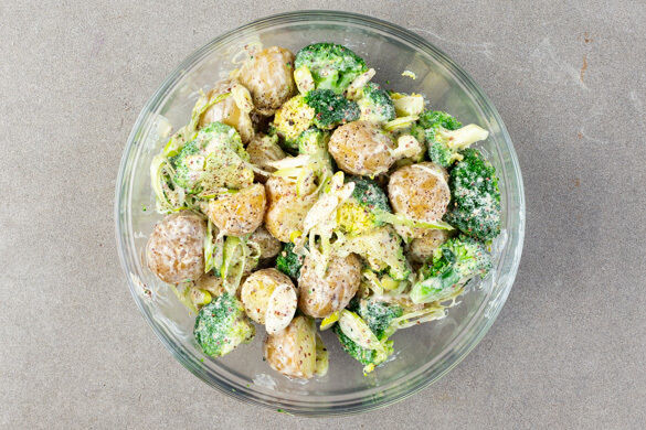 In zwei mittelgroßen Töpfen mit Deckeln ausreichend gesalzenes Wasser für die Kartoffeln bzw. den Brokkoli zum Kochen bringen. Die Kartoffeln samt Schale in einem der Töpfe 15–20Min. kochen, bis sie gar sind. In ein Sieb abgießen und mit kaltem Wasser abspülen.
