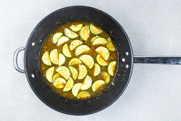Die Zucchini, den Knoblauch und die Gewürzmischung in einer großen Pfanne mit 2EL Olivenöl und 1 kräftigen Prise Salz bei mittlerer Hitze ca. 3Min. anbraten. Mit 300ml heißem Wasser ablöschen, das Brühgewürz unterrühren und die Zucchini noch ca. 8Min. garen, bis sie weich ist. Die Pfanne vom Herd nehmen.