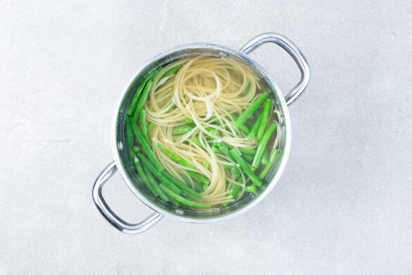 Die Pasta und die Bohnen in das kochende Wasser geben und 8–10Min. kochen, bis die Pasta bissfest ist und die Bohnen gar sind. Tipp: Wer die Bohnen knackiger mag, gibt sie erst nach der Hälfte der Zeit zur Pasta in den Topf. Mit einem Messbecher ca. 200ml Pastawasser abschöpfen, dann die Pasta und die Bohnenin ein Sieb abgießen und abtropfen lassen.