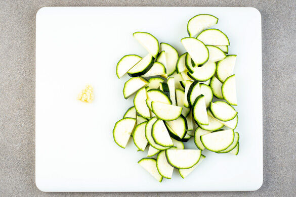 In einem großen Topf ausreichend gesalzenes Wasser für die Pasta und die Bohnen zum Kochen bringen. Den Knoblauch schälen und fein würfeln. Die Zucchini längs halbieren und in dünne Scheiben schneiden.