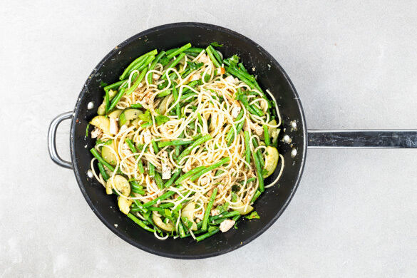 Das geräucherte Hähnchenfleisch und gehackte Pistazien machen dieses schnelle Pastagericht zu einem besonderen Erlebnis. Die grünen Bohnen und Zucchini sind aber auch nicht nur fürs Auge schön, sondern weitere leckere Bestandteile der feinen Zitronensauce. Und ja, ein Hauch geriebener Käse darf natürlich auch nicht fehlen. Lasst es euch schmecken!