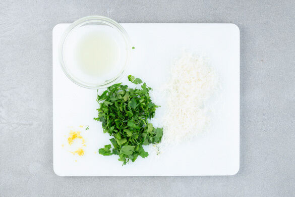 Die Petersilie samt Stängeln grob hacken. Die Zitronenschale abreiben, dann die Zitrone halbieren und auspressen. Den Käse fein reiben.