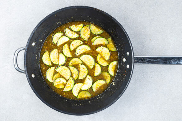 Die Zucchini, den Knoblauch und die 1/2 der Gewürzmischung in einer großen Pfanne mit 1EL Olivenöl und 1 Prise Salz bei mittlerer Hitze ca. 3Min. anbraten. Mit 200ml heißem Wasser ablöschen, die 1/2 des Brühgewürzes unterrühren und die Zucchini noch ca. 8Min. garen, bis sie weich ist. Die Pfanne vom Herd nehmen.