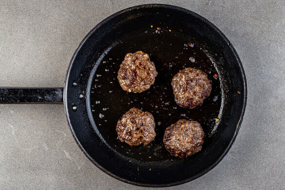 Die Pattys aus der Pfanne nehmen und auf einem Teller beiseitestellen. Die Brötchen aufschneiden und in dem Bratfett bei mittlerer bis starker Hitze 1–2Min. anbraten, bis die Schnittseiten leicht gebräunt sind. Die Brötchen mit der Karottenraita, den Pattys und etwas Tomaten-Gurken-Salat belegen. Auf Teller verteilen und mit dem übrigen Salat servieren.