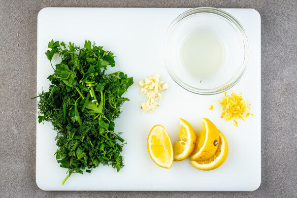 Den Schnittlauch, den Dill und die Petersilie samt Stängeln grob schneiden. Den Knoblauch schälen und ebenfalls grob schneiden. Die Zitronenschale abreiben und die Zitrone halbieren. Eine Zitronenhälfte auspressen, die andere Hälfte in Spalten schneiden.