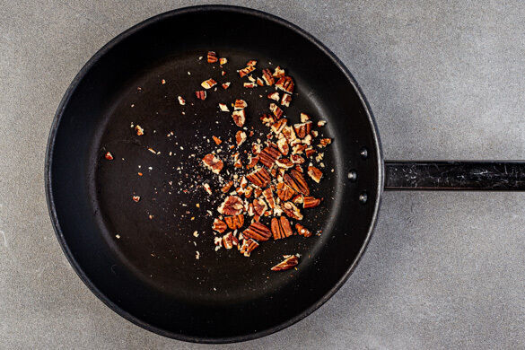 Den Backofen auf 200°C (180°C Umluft) vorheizen. Die Pekannüsse grob hacken und in einer kleinen Pfanne ohne Zugabe von Fett bei mittlerer Hitze 1–2Min. anrösten. Vorsicht, sie können schnell zu dunkel werden. Zum Abkühlen aus der Pfanne nehmen und beiseitestellen.