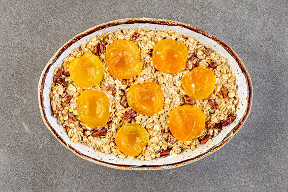 Den Boden und die Seiten einer kleinen Auflaufform mit 1TL Butter einfetten. Die Misobutter mit dem Haferflocken-Mix vermengen und den Haferbrei in die Auflaufform geben. Die Aprikosen mit der Schnittseite nach oben auf dem Brei anrichten, mit Alufolie abdecken und 30–40Min. im Ofen backen. Die Folie ca. 10Min. vor Ende der Garzeit entfernen und den Brei goldbraun backen.