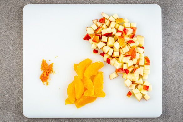 Etwa die 1/2 der Orangenschale abreiben, dann die Orange schälen und das Fruchtfleisch in ca. 1cm breite Spalten schneiden. Den Apfel vierteln, entkernen und in ca. 1cm große Würfel schneiden.