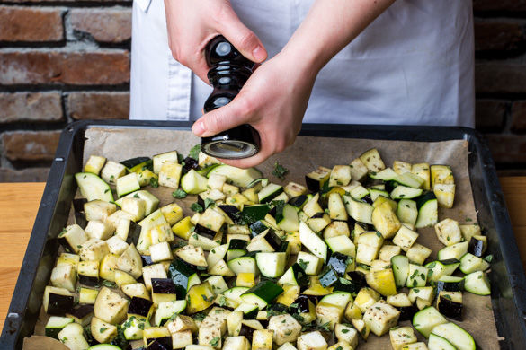Den Ofen auf 200°C Umluft oder 220°C Ober-/Unterhitze vorheizen. Die Enden der Zucchini und der Auberginen entfernen und beides in ca. 2cm große Würfel schneiden.