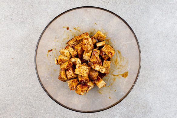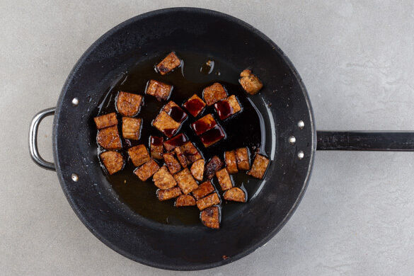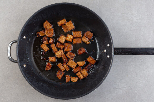 Die Tempehwürfel samt Würzsauce in derselben Pfanne mit ggf. 1–2TL Pflanzenöl bei starker Hitze 2–3Min. anbraten.