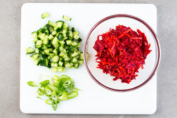 Die Rote Bete schälen und mit einer Küchenreibe grob raspeln, dabei am besten Küchenhandschuhe und Schürze tragen. Die Karotte ggf. schälen und ebenfalls grob raspeln. Das geraspelte Gemüse mit der veganen Mayonnaise, 1EL Essig und 1/2TL Salz vermengen. Die Gurke in ca. 1cm große Würfel, die Lauchzwiebel in feine Ringe schneiden.
