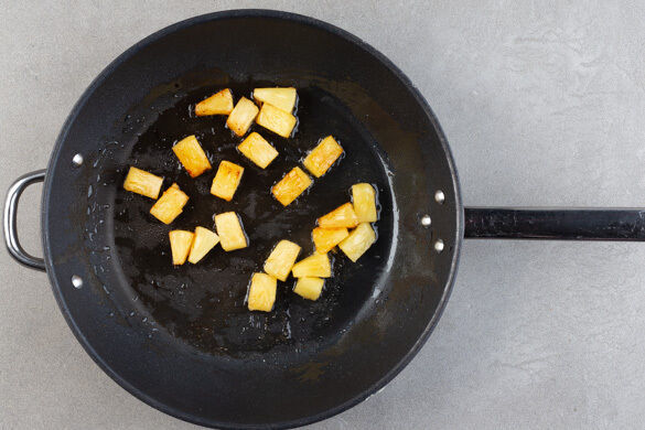 In einer großen Pfanne 1–2EL Pflanzenöl stark erhitzen. Die Ananas in ein Sieb abgießen, dabei den Saft auffangen. Sobald das Öl in der Pfanne sehr heiß ist, die Ananas hineingeben und 2–3Min. goldbraun braten, dabei nicht zu häufig umrühren. Die Ananas aus der Pfanne nehmen, mit je 1 Prise Salz und Pfeffer würzen und auf einem Teller beiseitestellen.