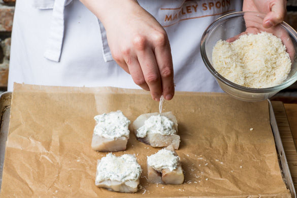 Ca. die 1/2 der Kräutercreme auf dem Fisch verstreichen, den Rest für später beiseitestellen. Die Panko-Käse-Mischung großzügig über die Kräutercreme streuen.