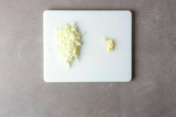Die Zwiebeln schälen, halbieren und in feine Würfel schneiden. Den Knoblauch schälen und ebenfalls fein würfeln.