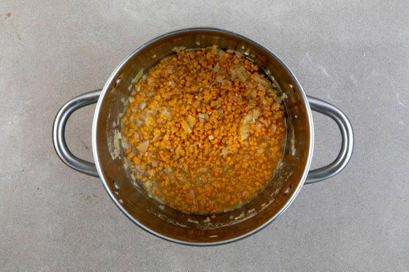 Die Zwiebeln und den Knoblauch in einem großen Topf mit 2EL Olivenöl bei mittlerer Hitze 1–2Min. anschwitzen. Die Linsen hinzugeben und mit 1,5L Wasser ablöschen. Das Brühgewürz hinzugeben und alles ca. 10Min. sanft köcheln lassen.