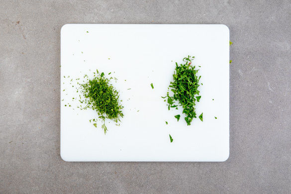 Die Petersilie und den Dill samt Stängeln fein schneiden. Das Linsenpüree auf Teller verteilen, das Fleisch in Tranchen schneiden und darauf anrichten. Mit den Kräutern und ggf. übrigem Paprikapulver garnieren und mit den Crudités servieren.