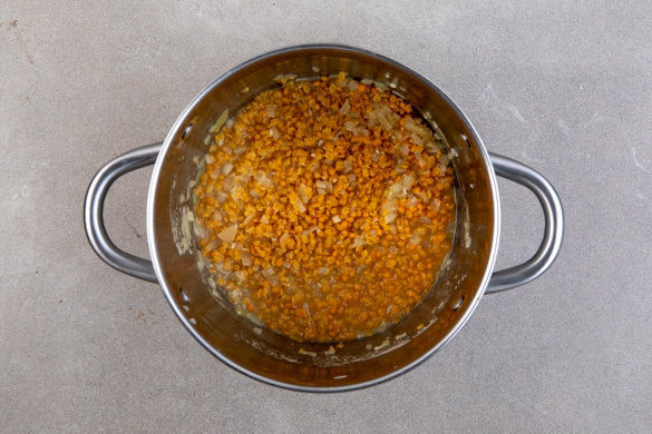 Die Zwiebeln und den Knoblauch in einem mittelgroßen Topf mit 1EL Olivenöl bei mittlerer Hitze 1–2Min. anschwitzen. Die Linsen hinzugeben und mit 750ml Wasser ablöschen. Das Brühgewürz hinzugeben und alles ca. 10Min. sanft köcheln lassen.