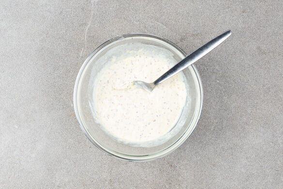 Den Backofen auf 240°C (220°C Umluft) vorheizen. Die Zitronenschale abreiben, dann die Zitrone halbieren und auspressen. Den Knoblauch schälen und fein reiben. Ca. 2/3 der Crème fraîche mit dem Senf, der Zitronenschale, 2EL Zitronensaft, dem Knoblauch, 1 kräftigen Prise Salz und 1 Prise Pfeffer verrühren.