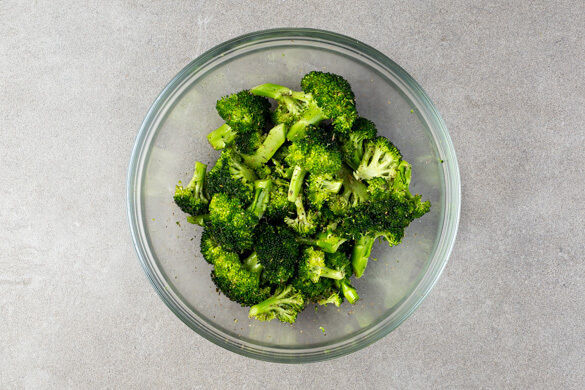 Den Brokkoli in mundgerechte Röschen schneiden und mit 1EL Olivenöl, der restlichen Gewürzmischung sowie je 1 Prise Salz und Pfeffer vermengen.