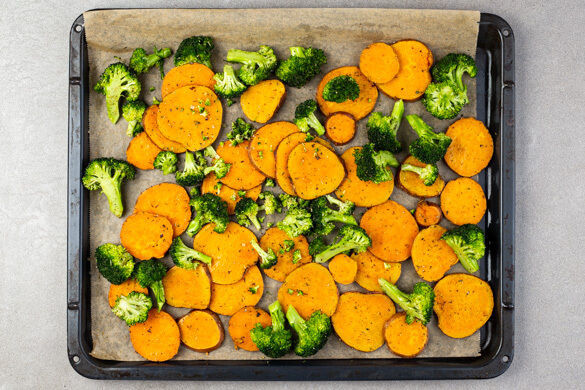 Die Süßkartoffeln nach 10Min. aus dem Ofen nehmen, wenden, den Brokkoli dazugeben und das Gemüse 12–15Min. backen.