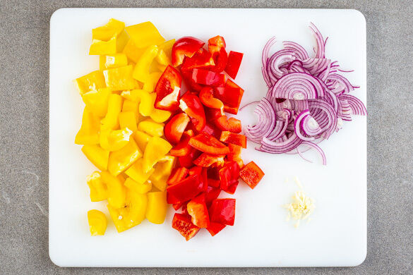 In einem großen Topf ausreichend gesalzenes Wasser für die Pasta zum Kochen bringen. Die Paprika vierteln, entkernen und in 2–3cm große Stücke schneiden. Die Zwiebeln schälen, halbieren und in dünne Streifen schneiden. Den Knoblauch schälen und fein würfeln.
