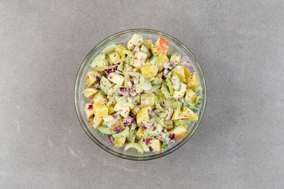 Den Sellerie in dünne Streifen schneiden. Die Gurke längs vierteln und quer in dünne Scheiben schneiden. Die Zwiebel schälen, halbieren und fein würfeln. Den Apfel vierteln und in 1–2cm große Würfel schneiden, dabei das Kerngehäuse entfernen. Den Sellerie, die Gurken, die Zwiebeln, die Äpfel und die abgekühlten Kartoffeln mit dem Dressing vermengen.