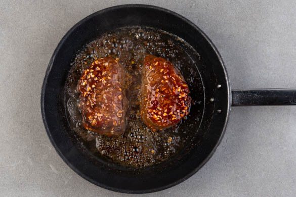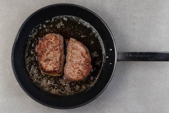 Das Fleisch trocken tupfen, auf jeder Seite mit je 1 Prise Salz und Pfeffer würzen und in einer mittelgroßen Pfanne mit 1EL Pflanzenöl bei starker Hitze auf jeder Seite 2–3Min. braten, abhängig davon, ob es medium oder eher durchgebraten sein soll.