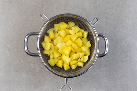 In einem mittelgroßen Topf ausreichend gesalzenes Wasser für die Kartoffeln zum Kochen bringen. Die Kartoffeln schälen, in 2–3cm große Würfel schneiden, in das kochende Wasser geben und in 12–15Min. gar kochen. In ein Sieb abgießen und abkühlen lassen.