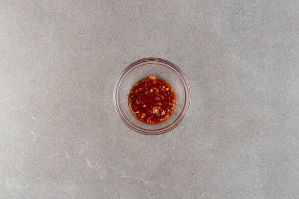 Den Knoblauch schälen und sehr fein würfeln oder durch eine Knoblauchpresse drücken, dann mit der BBQ-Sauce, 2EL Essig und 1 kräftigen Prise Pfeffer verrühren.