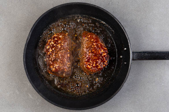 Das Fleisch trocken tupfen, auf jeder Seite mit je 1 Prise Salz und Pfeffer würzen und in einer großen Pfanne mit 1EL Pflanzenöl bei starker Hitze auf jeder Seite 2–3Min. braten, abhängig davon, ob es medium oder eher durchgebraten sein soll.