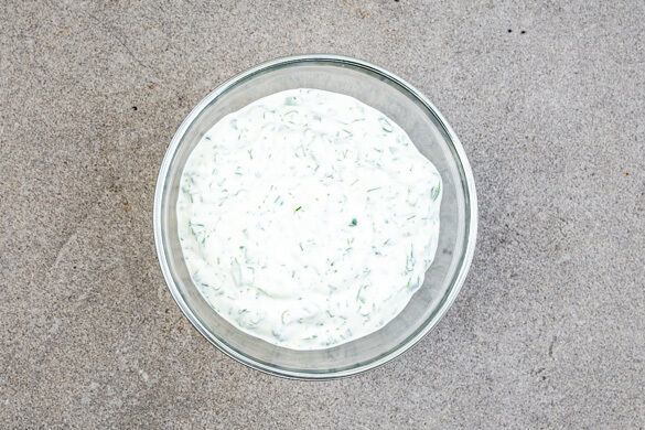 Den Kerbel, den Schnittlauch und den Dill samt Stängeln fein schneiden. 3/4 der Kräuter mit der sauren Sahne und 1 kräftigen Prise Salz verrühren.