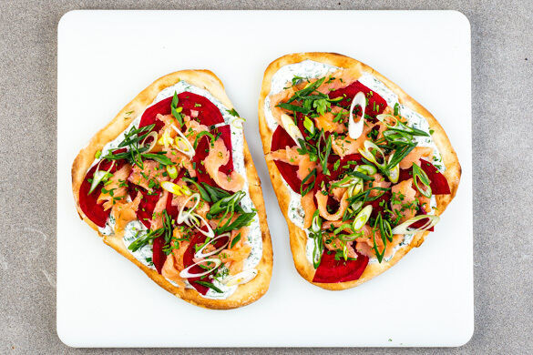 Die Lauchzwiebel in feine Ringe schneiden. Die Brote mit der Roten Bete, den Räucherlachsschnetzeln sowie den Lauchzwiebeln belegen und mit den restlichen Kräutern garnieren. Die Brote mit den Zucchinipommes und dem Kräuterdip servieren.