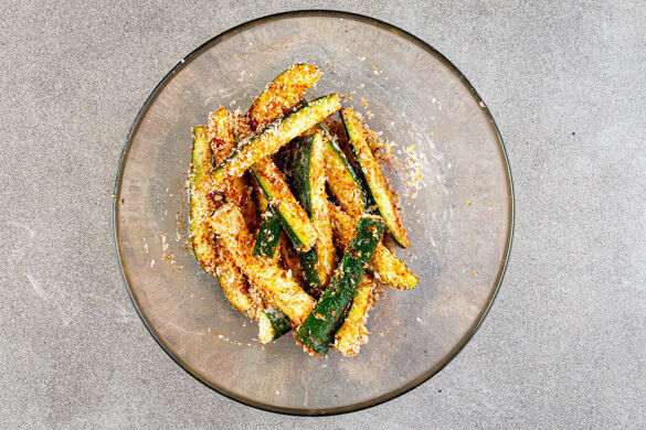 Das Bratkartoffelgewürz mit 4EL Mehl, 2EL Olivenöl, 4EL Wasser und 1/2TL Salz verrühren. Die Zucchini in 5–7cm lange, pommesartige Stifte schneiden und mit der Mehl-Mischung vermengen. Anschließend das Paniermehl untermengen, bis die Zucchini rundum bedeckt sind.