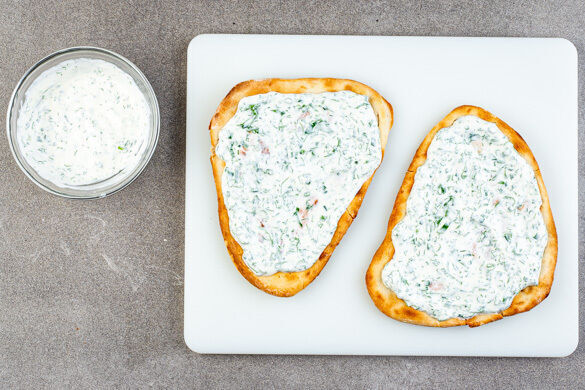 Die Naanbrote mit der 1/2 der Kräutercreme bestreichen. Die restliche Kräutercreme mit 2EL Mayonnaise zu einem Dip verrühren.