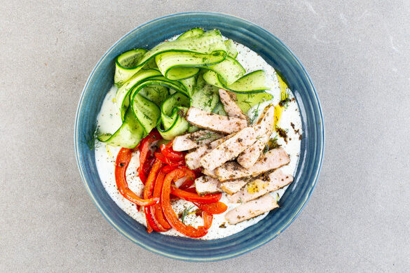 Die Gewürzmischung Za’atar ist fester Bestandteil der arabischen und nordafrikanischen Küche. Wichtigste Geschmacksgeber sind wilder Thymian, gerösteter Sesam und säuerlicher Sumach, und genau darin wendest du heute die saftigen Steakstreifen. Sie werden serviert auf einem erfrischenden Basilikumjoghurt, dazu gibt es feinen Gurkensalat mit frischem Dill und gebratener Paprika. Leicht, lecker und lässig schnell gemacht!