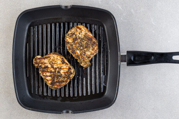 Das Fleisch trocken tupfen und mit der 1/2 der Gewürzmischung, 1EL Olivenöl, 1EL Essig und 1 Prise Salz einreiben. Das Fleisch in einer Grillpfanne oder einer mittelgroßen Pfanne bei mittlerer bis starker Hitze auf jeder Seite 2–3Min. anbraten. Anschließend aus der Pfanne nehmen und in Streifen schneiden.