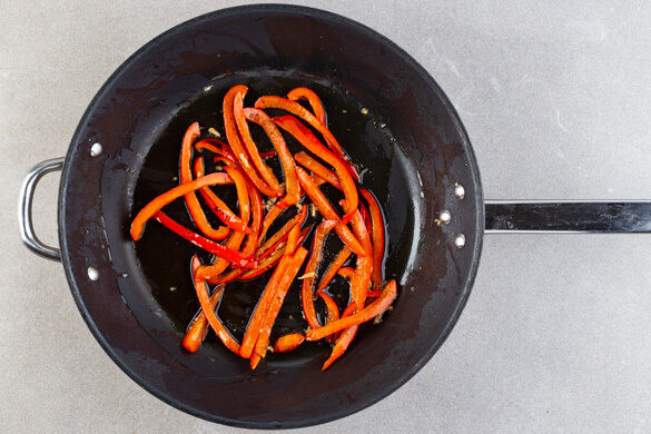 Die Paprika in einer mittelgroßen Pfanne mit 1EL Olivenöl und 1 Prise Salz bei mittlerer bis starker Hitze 5–8Min. anbraten, bis die Paprika weich wird. Ca. 2Min. vor Ende der Garzeit den restlichen Knoblauch hinzufügen und mitbraten.