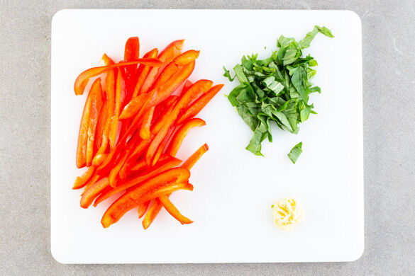 Die Paprika vierteln, entkernen und in dünne Streifen schneiden. Den Knoblauch schälen und fein würfeln oder reiben. Die Basilikumblätter von den Stängeln zupfen und fein schneiden.
