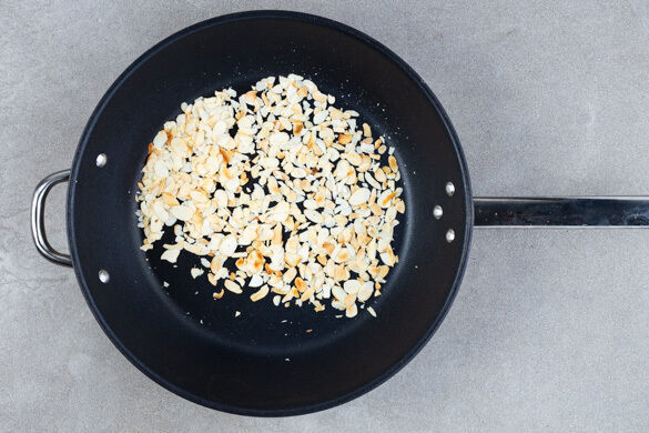 Die Mandeln grob hacken und in einer kleinen Pfanne ohne Zugabe von Fett bei mittlerer Hitze 1–2Min. goldbraun anrösten. Vorsicht, sie können schnell zu dunkel werden. Zum Abkühlen aus der Pfanne nehmen und beiseitestellen.